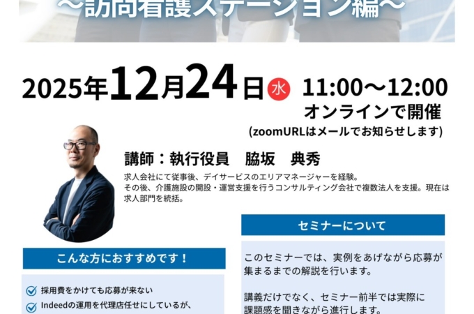 求人セミナー【応募が来ない!を脱却 ~デイサービス編~】のご案内です。 大阪にて開催された「デイフェス2025」参加された方を中心に開催いたします。 ...